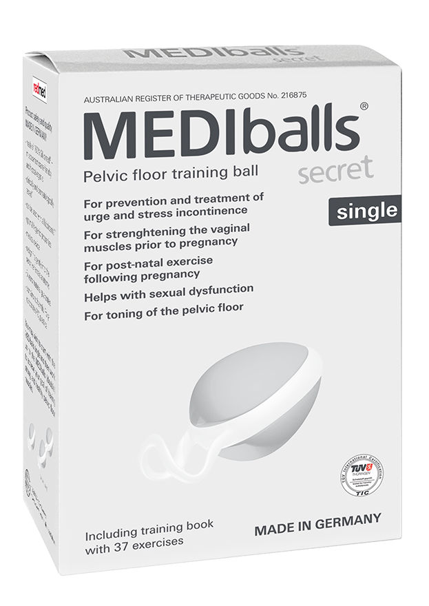 A specially designed, weighted vaginal training ball for the female pelvic floor. This device strengthens female pelvic floor muscles in as little as 7 days, with or without pelvic floor exercises. Start pelvic floor muscle training on the Single MEDIballs Secret, then progress to the Double, currently both are available as a package. Each MEDIballs Secret kit includes a complimentary pelvic floor exercise training program with 37 exercises and a free, pink satin bag for storage. For ease of use we recommend inserting with our 100% organic lubricant BIOglide, available on special now with any MEDIballs Secret package.